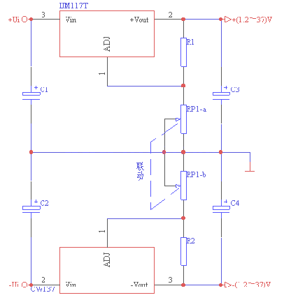 下图为采用CW117和CW137组成的正、负对称输出可调的稳压电源电路,输出电压±(1.2—37V),最大输出电流1.5A。调节双连同轴电位器RP1,即可使正、负输出电压的绝对值同步变化。